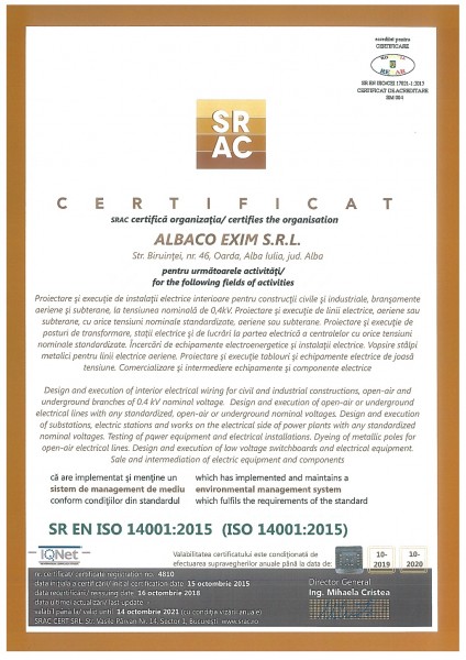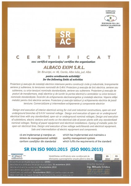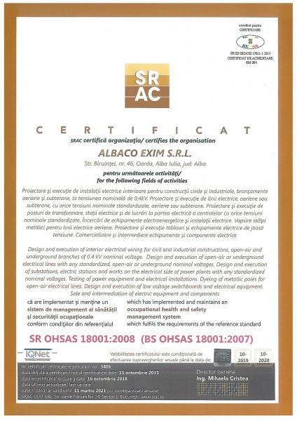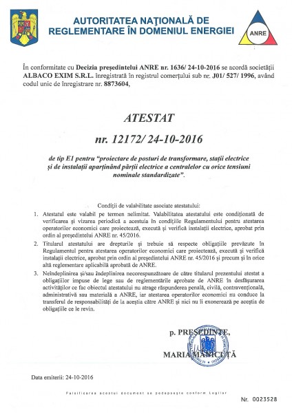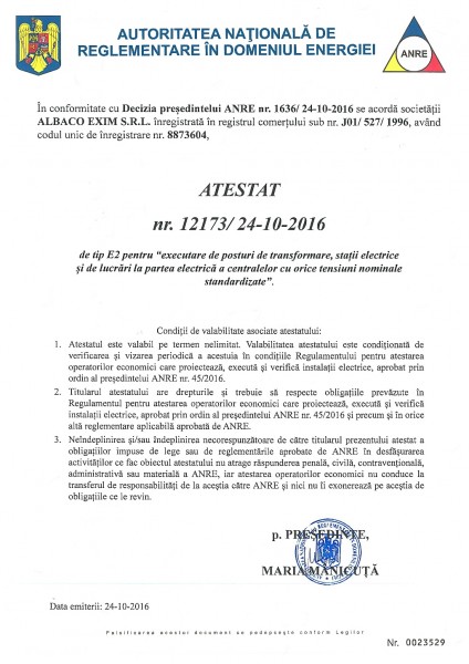 Pentru desfasurarea lucrarilor in instalatiile de distributie a energiei electrice din Romania, SC Albaco Exim SRL a obtinut urmatoarele atestate de la Agentia Nationala de Reglementare in domeniul Energiei - ANRE: